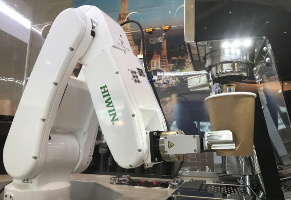 泰国咖啡商引进上银的智慧咖啡机器人,民众只要投币,六轴机器人就会启动,依照顾客喜好,有三种咖啡豆、加糖加奶等四十五种组合可供选择。从取杯、取胶囊、加奶、加糖浆、盖上杯盖、送到客人面前,全部由机器手臂搞定;最后还不忘拆下冲煮头清洗,再归回原位。与目前市面上机器人只负责按下咖啡机按钮相比,智慧程度及软硬件整合能力更升级。